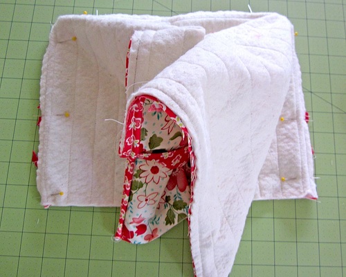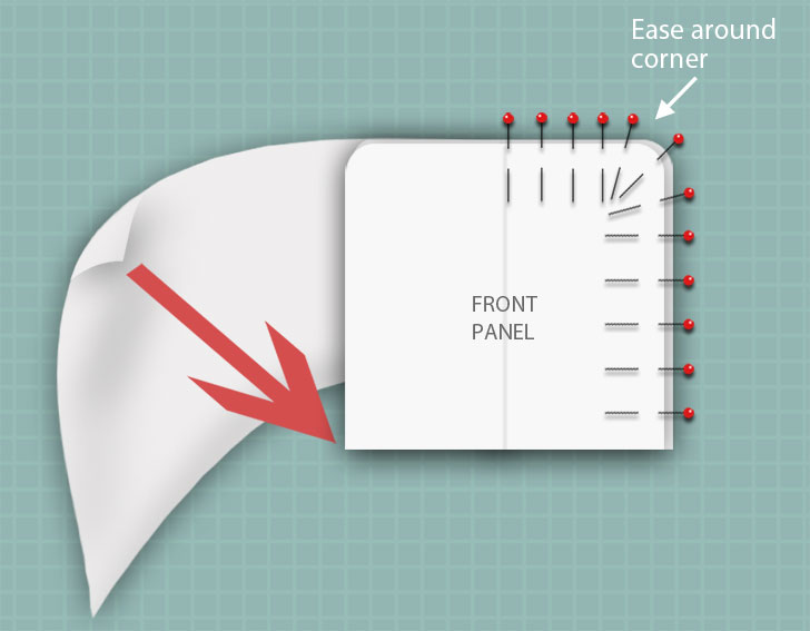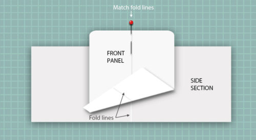 - Fold the side section panel down, easing it around the rounded corner of the front panel, and continue pinning the two layers right sides together. The bottom of the side section panel should match up perfectly with the bottom square corner of the front panel.