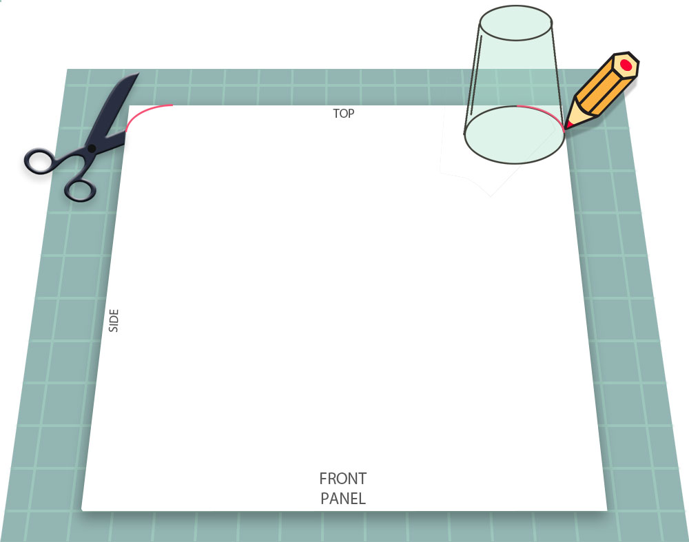 - Find a small juice glass or other small round object. Place the glass in each of the top corners (one of the 12½” sides) and trace the outside curve.