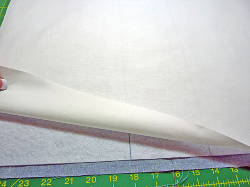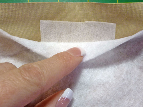 - Along both the top and bottom edges of the lining panel, gently peel back the fusible fleece at the center point and slip a square of interfacing behind the fleece. The top edge of the interfacing square should be flush with the top of the fleece.