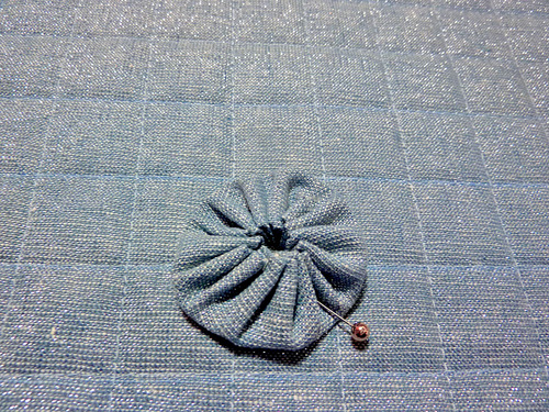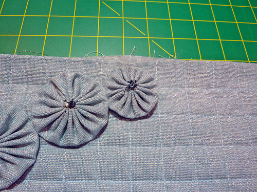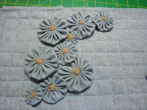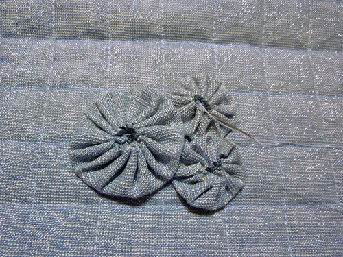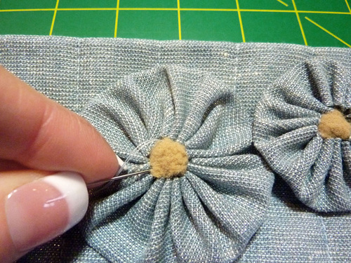 NOTE: The Kaufman metallic linen was stable enough to hold its shape with just the center stitch point. If you use a lighter weight fabric for your yo-yos, you may need to lightly tack the outer edges of the yo-yos to make sure each remains flat and does not droop forward.