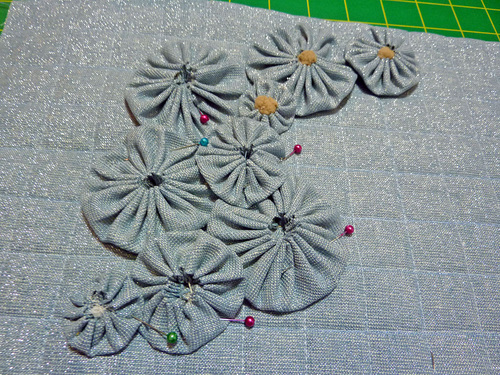 - Pin the yo-yos in place, using the quilted grid pattern to help you position each.