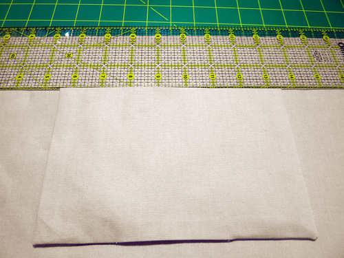 - Fold the pocket panel right sides together along the original center crease line. Pin along both sides and across the bottom, leaving a 3-4” opening along the bottom for turning.