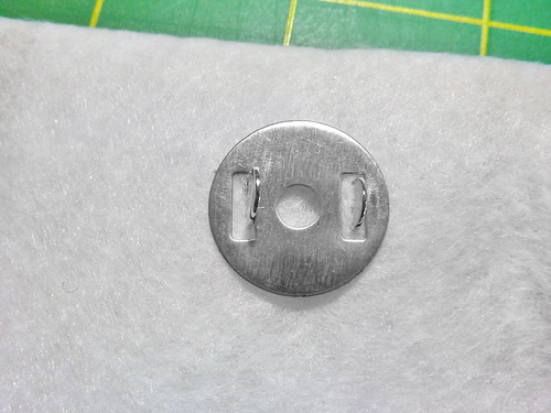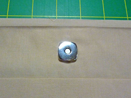 - Insert each half of the magnetic snap at these center points. The center of the snap should sit 1½” down from the raw edge of the panel. Use the plate to mark this position for each half on the right side of the lining.