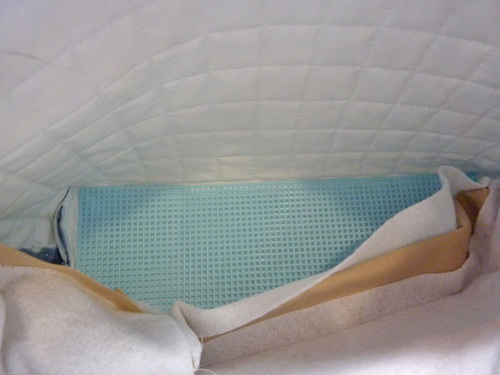 - Find the plastic canvas panel. Place it inside the exterior box against the base panel. Our panel was a snug fit so nothing else was needed to hold it in place. If you feel your panel is less stable, you can adhere it in place with fusible seam tape or similar.