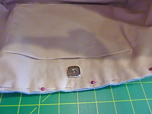 - Fold the lining panel in half, sandwiching the pocket and the snap between the layers. Pin along both sides.