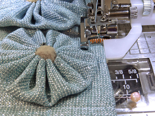 - Along the top, don’t forget that you’ll need to fold down the raw edge ½” and edgestitch to finish. Don’t place your yo-yos too close to that raw edge.