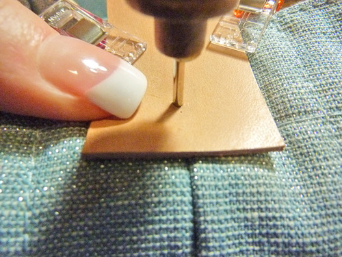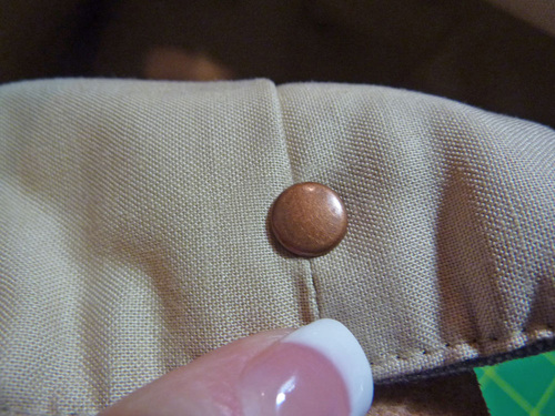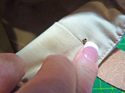- Place the strap back into position against the tote, lining up the holes, and insert a rivet from front to back at each side through all the layers.