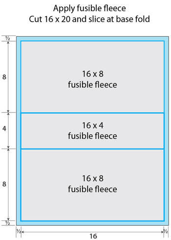 - From the fusible fleece, cut TWO 16” x 20” rectangles. Then sub-cut EACH rectangle into TWO 16” x 8” rectangles and ONE 16” x 4” rectangle.