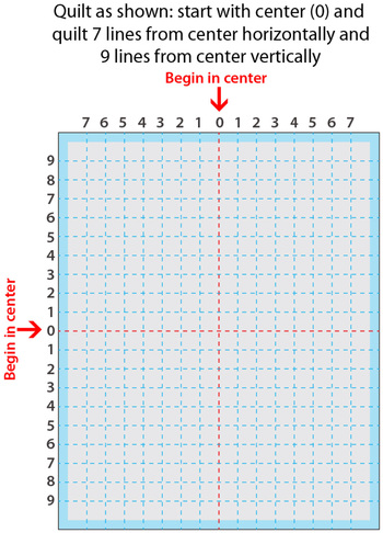 - With these intersecting center lines in place, draw in the remaining grid lines at 1” intervals: SEVEN vertical lines from the center out to the left, SEVEN vertical lines from the center out to the right, NINE horizontal lines from the center down, NINE horizontal lines from the center up. As you can see, there is room to do one additional line at each outer edge, but do not do any more lines than shown. The extra space is on purpose; when the side seams are sewn, the quilting will appear nearly continuous – without any random quilting stitches peeking out from the seams. You are so clever for stopping your lines!