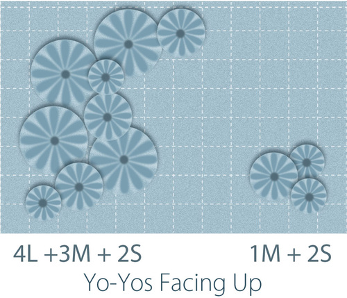Follow our placement pattern, which is made up of twelve yo-yos in three different sizes, or create your own bouquet. The windowpane quilting gives you a perfect grid to work with to determine position. As shown on our sample, overlapping the yo-yos is allowed, and actually produces a more realistic floral effect.