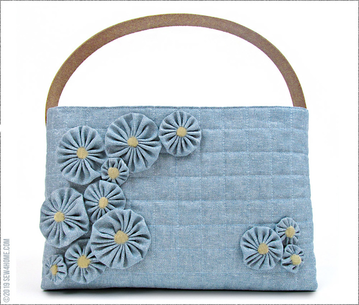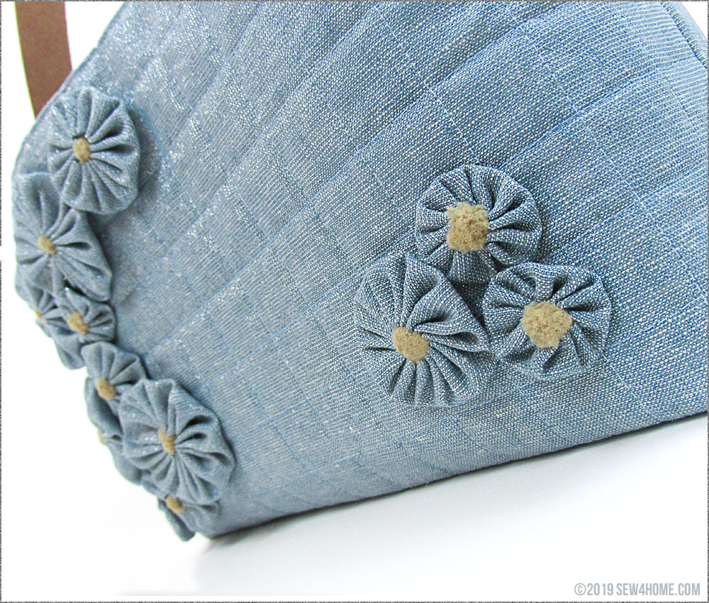 The windowpane grid has a tone-on-tone effect – just like the yo-yos. The precision of this quilting is very important to the overall elegance. The bag is created as a single panel, so there’s no seam to interrupt the lines from the front, across the bottom, and around to the back. And, if you follow our stitching diagram below, the side seams and boxed corners will also come together beautifully to maintain the continuous intersecting lines.