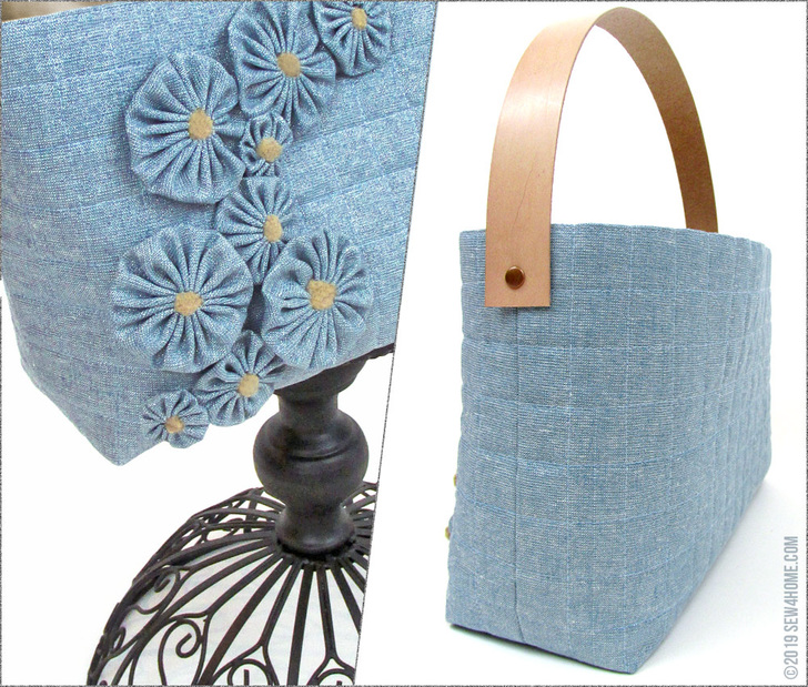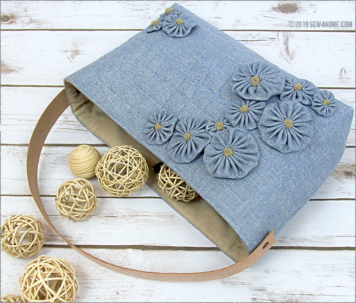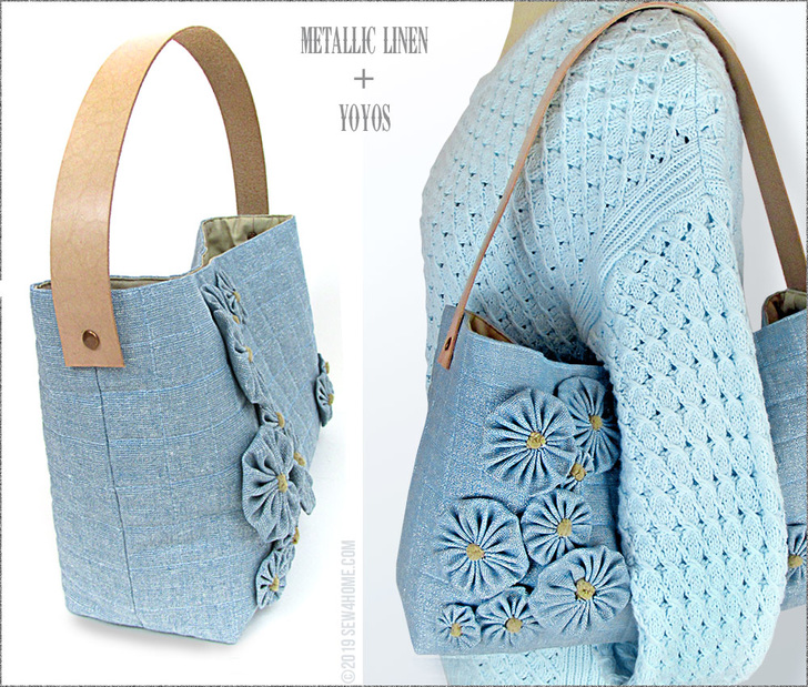 The front of a bag is a bit like a blank slate. It’s a lovely flat surface that can evolve into any number of wonderful looks. We started with a gorgeous metallic linen blend from Robert Kaufman Fabrics, then added a quilted windowpane grid, and finally, arranged twelve tone-on-tone yo-yos as the perfect dimensional accent. It’s elegant and fashionable with just the right pinch of whimsy.