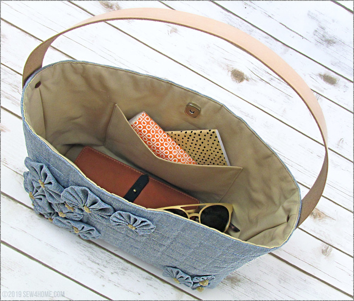 - Slip the lining inside the exterior so the two are now wrong sides together. Align the side seams and the bottom boxed corners. The pocket should sit against the back of the bag, opposite from the yo-yos.