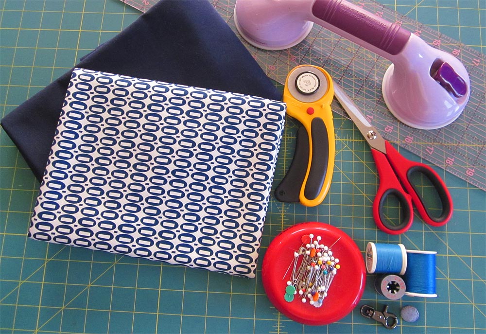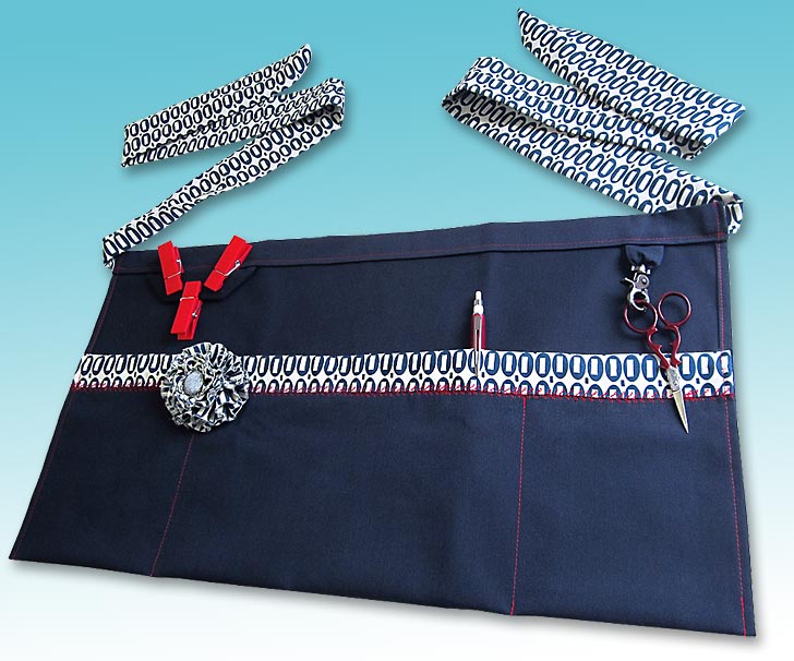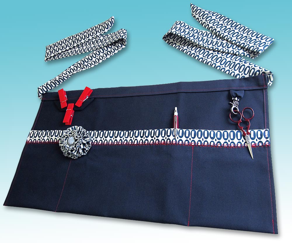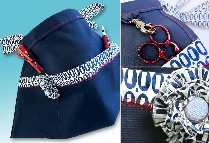 Our apron base fabric is EcoTwill in Navy from Fabric.com with pocket band and waist tie accents in Indigo Magic Beans from the Pezzy Prints collection by American Jane for Moda Fabrics, provided by Fat Quarter Shop.