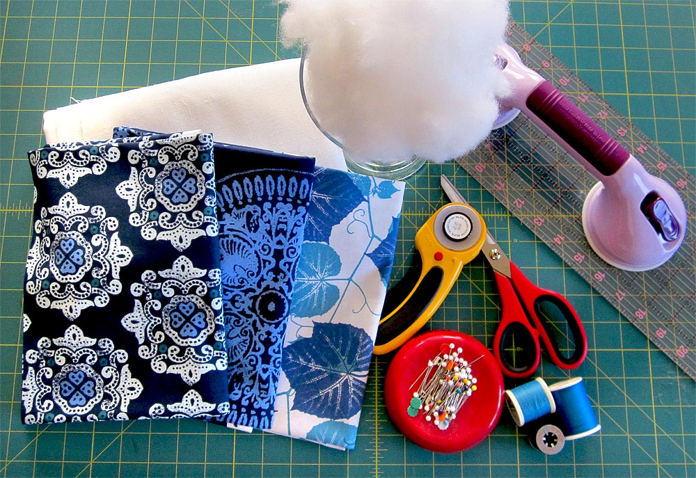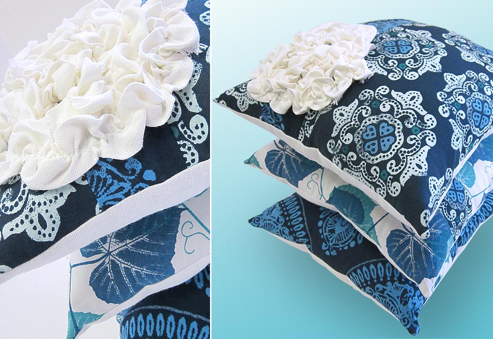 These eye-popping pillow fabrics are from the Impressions collection by Ty Pennington for Free Spirit Fabrics. Fat Quarter Shop provided us with three coordinating prints: Indigo Ivy, Blue Medallion and Blue Delhi. The fabric for all the pillow backs as well as the ruched accent flower is a lovely medium weight white linen from Fabric.com. We used Poly-Fil by Fairfield to plump up all three pillows.