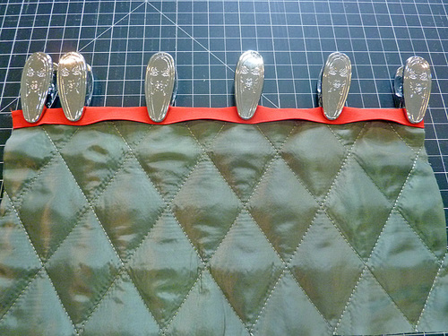 - Using the pins or clips, fold the elastic over the top raw edge of the pocket and pin or clip in place.
