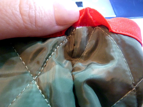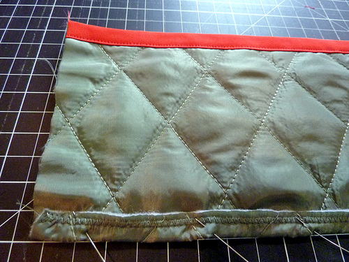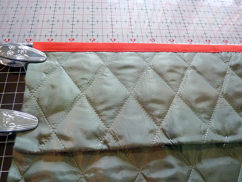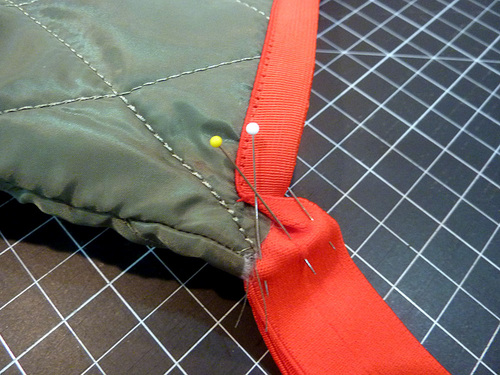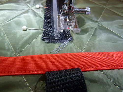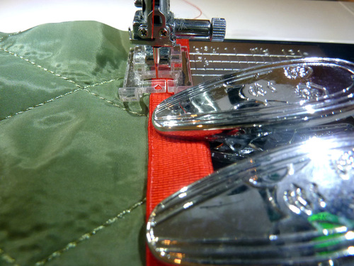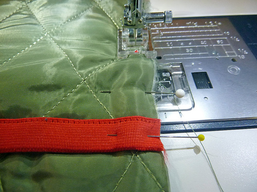 - As you did with the pocket binding, edgestitch the binding in place. Stitch slowly, being careful to insure you are catching both the front and the back of the elastic.
