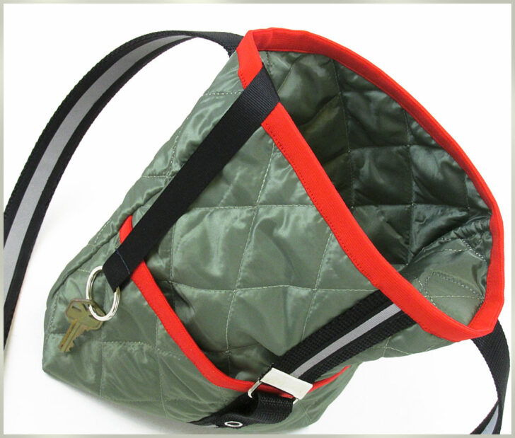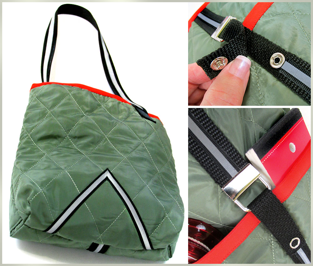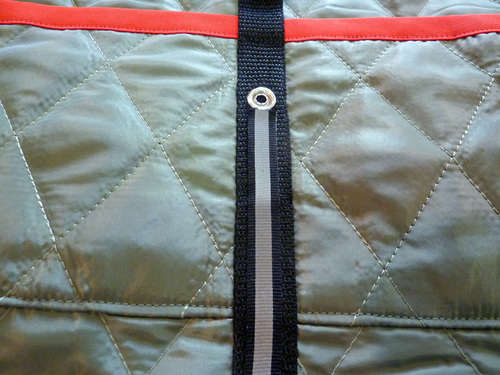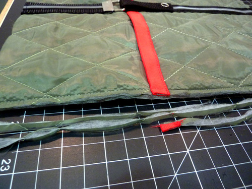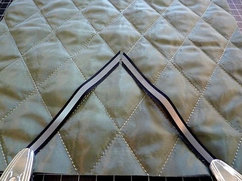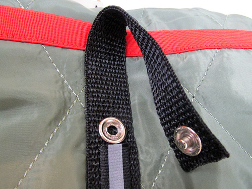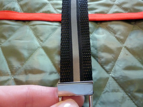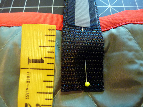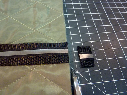 - Test the loop of the bottom webbing through the fob to confirm the position of the second half of the snap. When slipped through the fob, the webbing loop should extend above the binding just about ¼”. Adjust the position of the top webbing along the top raw edge of the panel, and make sure the bottom webbing loop completely covers the first half of the snap with about ¼” to spare – you want to well-cover the end of the reflective tape below the snap.
