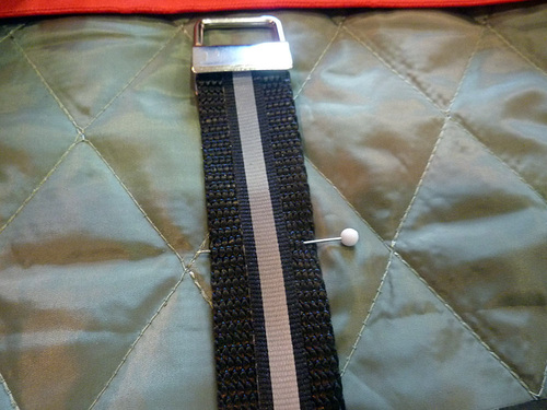 - Pin the raw end of the webbing/ribbon to the exact center of the top raw edge of the front panel. This should put this top portion of the clasp unit directly in line with the bottom clasp unit already stitched in place on the pocket.