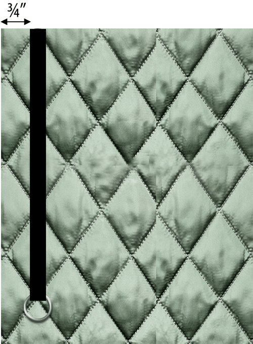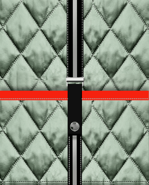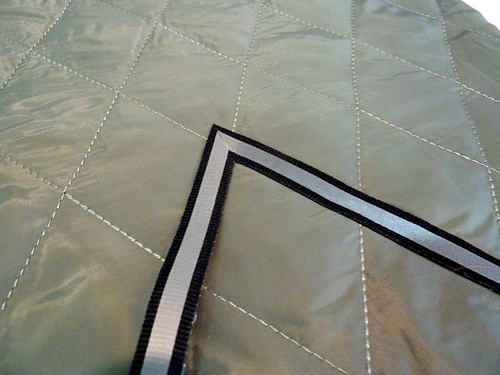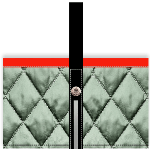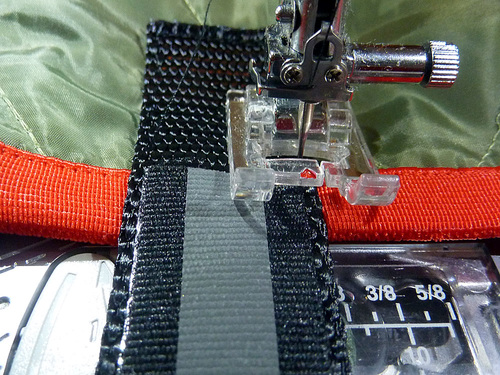 - Place the webbing at the exact center point of the pocket. The bottom edge of the webbing (the bottom is where the reflective ribbon and the webbing are aligned) is flush with the bottom raw edge of the panel (not the bottom of the pocket – the bottom raw edge of the panel). The top end of the webbing will extend beyond the top bound edge of the pocket about 3″.