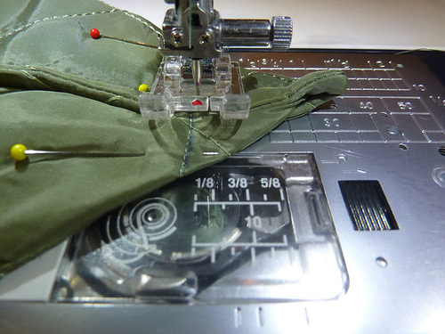 - When you get back around to your starting point, remove the bag from the machine and pin the 1″ free ends right sides together.