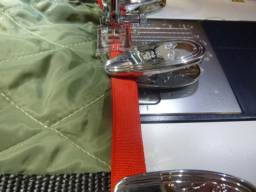 - Edgestitch both ends of the strap in place with a rectangle, running the seam along the bottom, up one side, back across the webbing just below the binding and back down the opposite side.