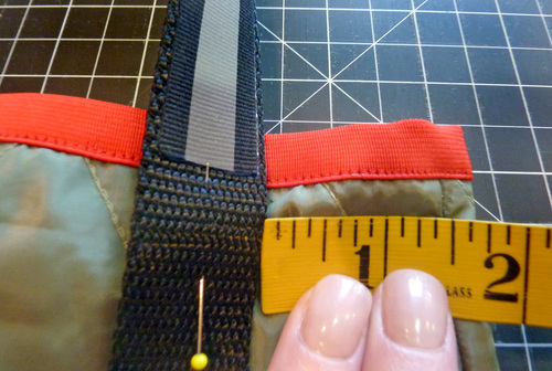 - One end of the webbing goes on the top right of the bag front. It should be positioned 1½” in from the right side seam…