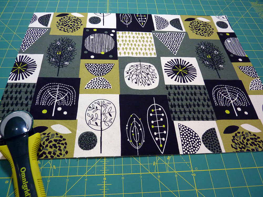 - Find one of the main exterior panels. Both should have been fussy cut to nicely center your fabric’s motif. If you like one panel better than the other, choose it to be the front panel. Place this panel right side up and flat on your work surface.