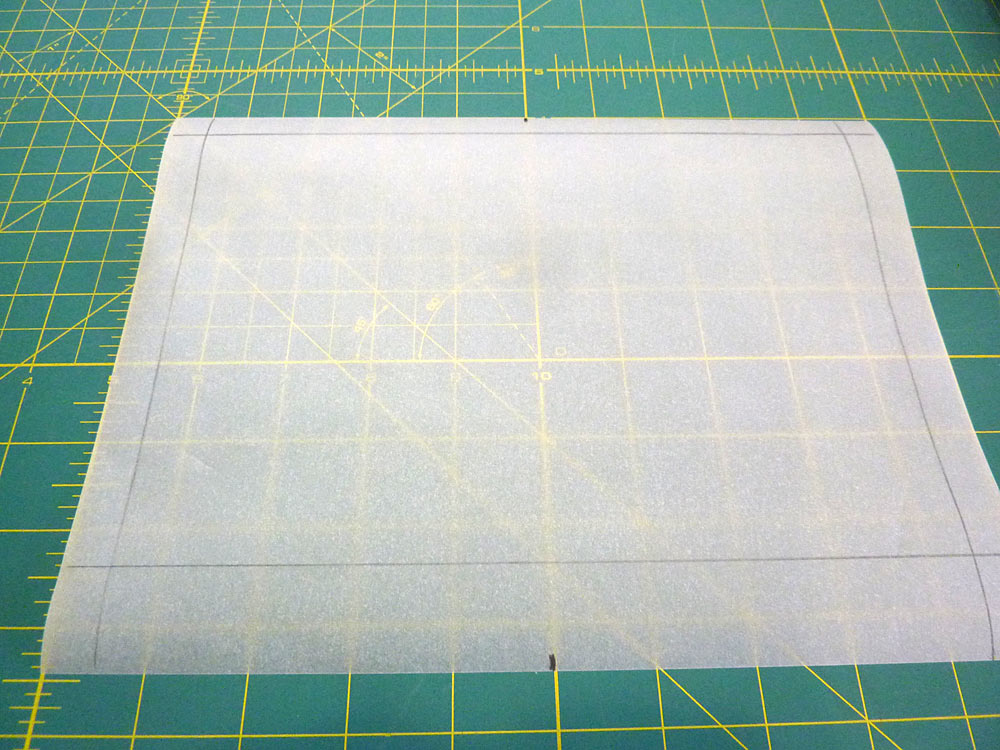 - From the tracing paper, cut one 10″ x 7½” rectangle (pocket base) and one 10″ x 4½” rectangle (pocket flap). Draw in the seam seam allowance lines on all sides (draw a line ½” in from each cut side) as well as the top and bottom center points. We drew in two lines across the bottom: one at 1” up as well as the ½” seam line to match the others. This was simply to give us some additional motif matching points across the bottom because our motifs are rather large; it is optional. The image below shows us finishing up our marks, just prior to drawing in the final ½” line along the bottom.