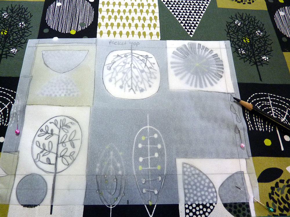 - Center the tracing paper rectangle on the front panel. Align the center marks so the pocket is centered side to side. The bottom of the paper rectangle should sit ½” up from the bottom raw edge of the fabric panel. Pin the paper rectangle in place and trace some of the motifs along all four sides.