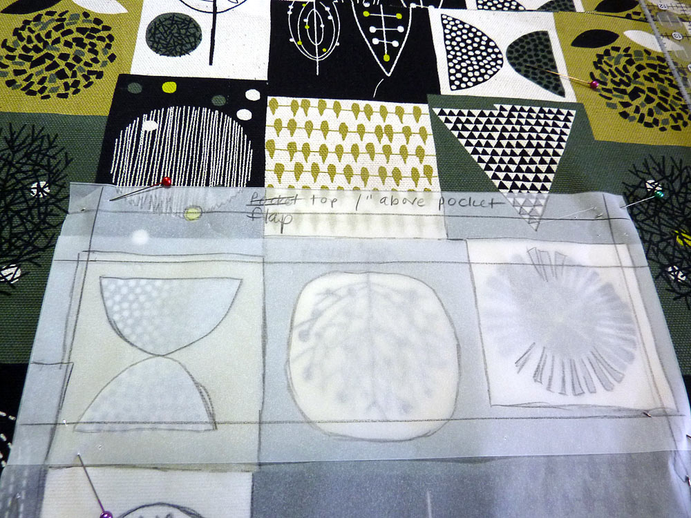 - Find the paper rectangle for the flap. Place it on top of the paper rectangle of the pocket base. Line up the drawn lines representing the side seam allowances. The finished top of the flap will sit 1” up from the finished top of the base pocket. Make sure you overlap correctly. This means the seam line of the top of the pocket flap should be 1” above the seam line of the pocket base. You can certainly draw in additional guide lines as needed. Pin the flap’s paper pattern in place over the pocket base pattern and trace the motifs around all four sides of the flap.