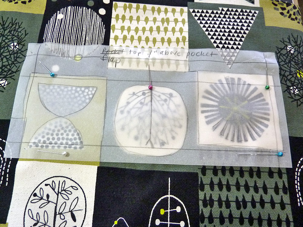 - Un-pin both paper rectangles from the front panel. Bring the papers to the remaining exterior fabric. Adjust each piece until the traced motifs line up with the motifs on the fabric. Pin the pattern to the fabric. The image below shows us matching up the flap. Repeat to match up the base.