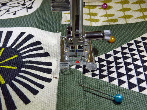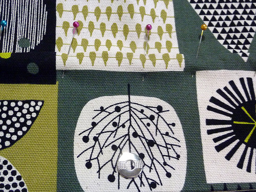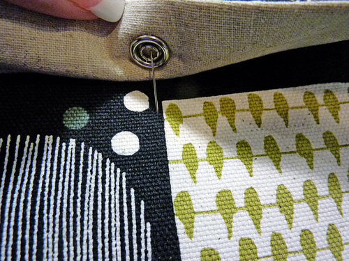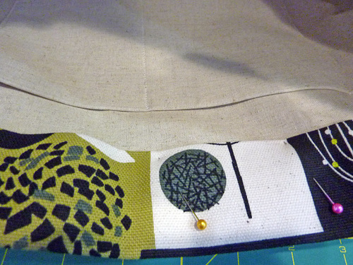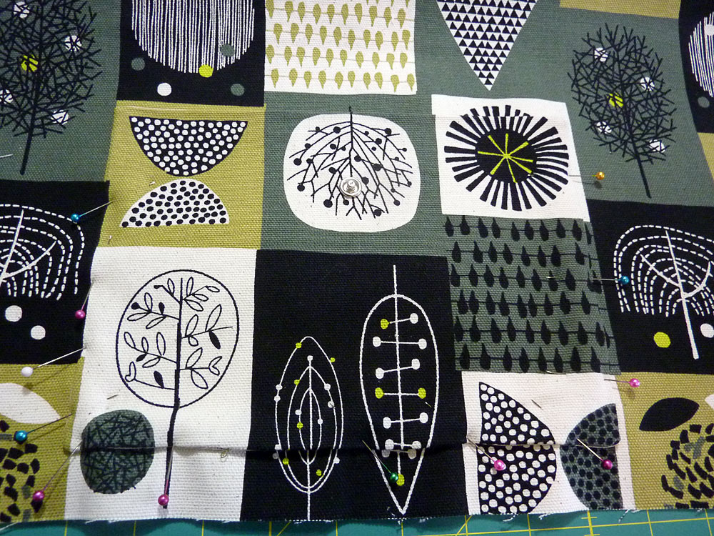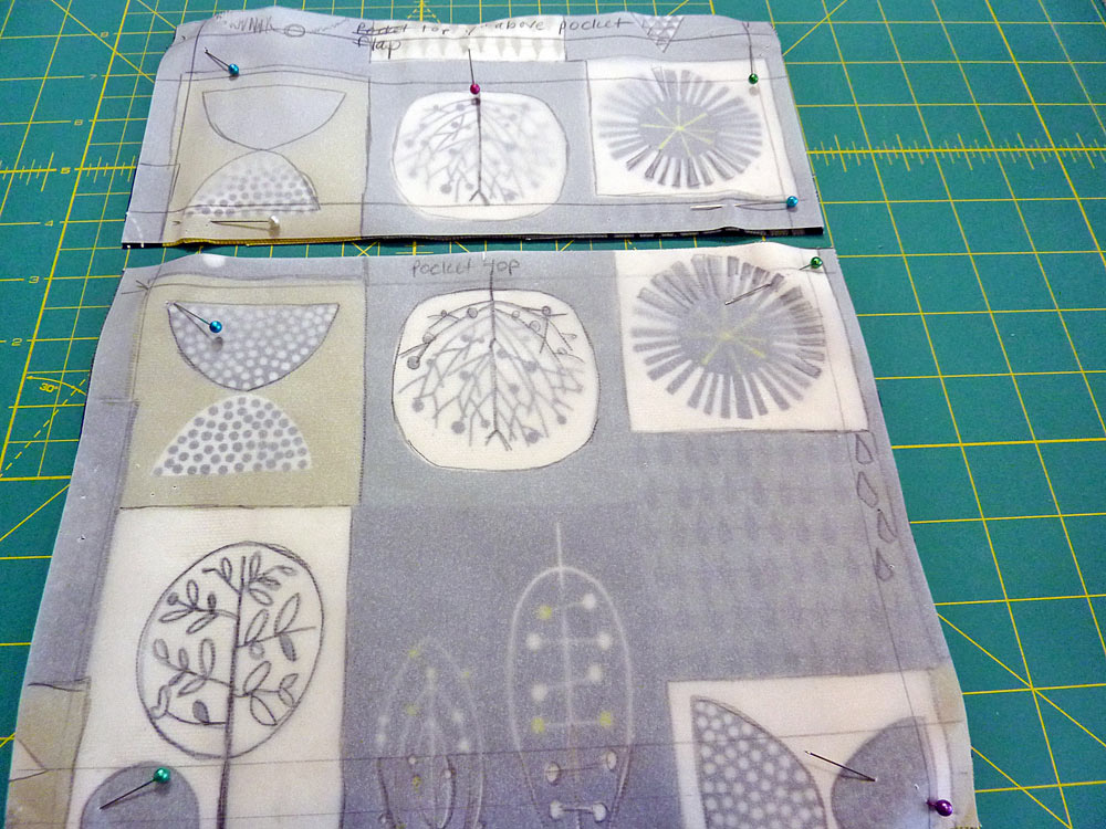 - Place the pocket flap in position over the pocket base, aligning the snap as well as the fussy cut motifs. Pin along the top edge only.