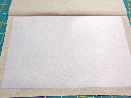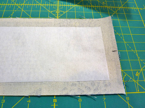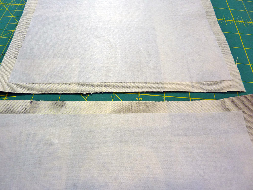 - Place the appropriate interfacing panel on the wrong side of each fabric panel. The interfacing should be centered top to bottom and side to side so there is ½” of fabric showing beyond the interfacing on all sides. Following manufacturer’s instructions, fuse the interfacing in place.