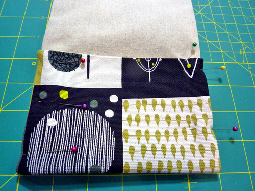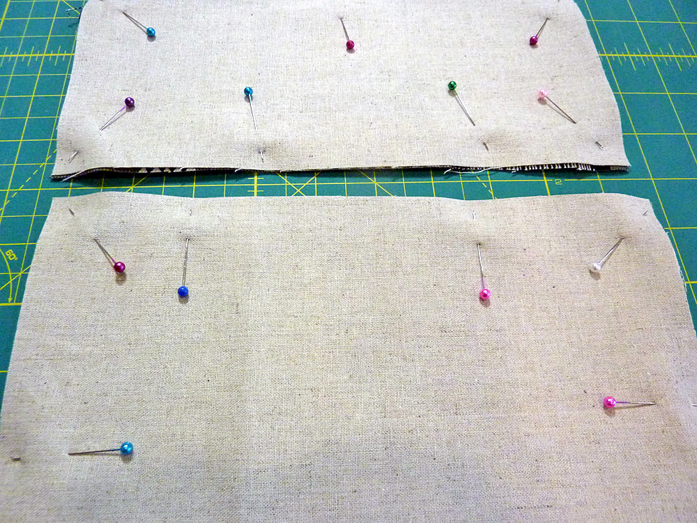 - Place the front and back lining panels right sides together, sandwiching the pocket between the layers. Pin along both sides.