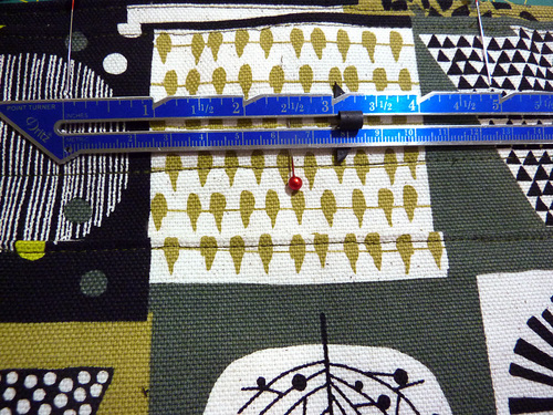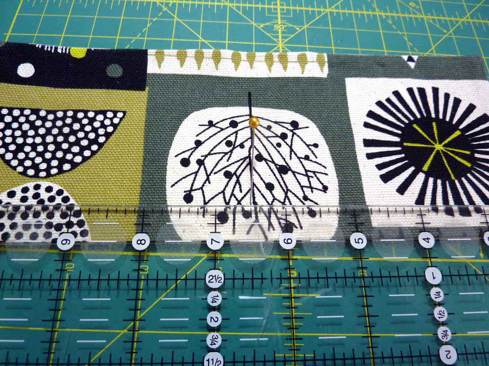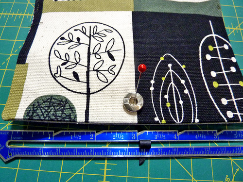 - Re-find the center point on both the front and back panels; this is right where your magnetic snap should be. Measure 2½” to the right of center and place a marking pin. Then measure 2½” to the left of center and place another marking pin. Do this on both the front and back panels.