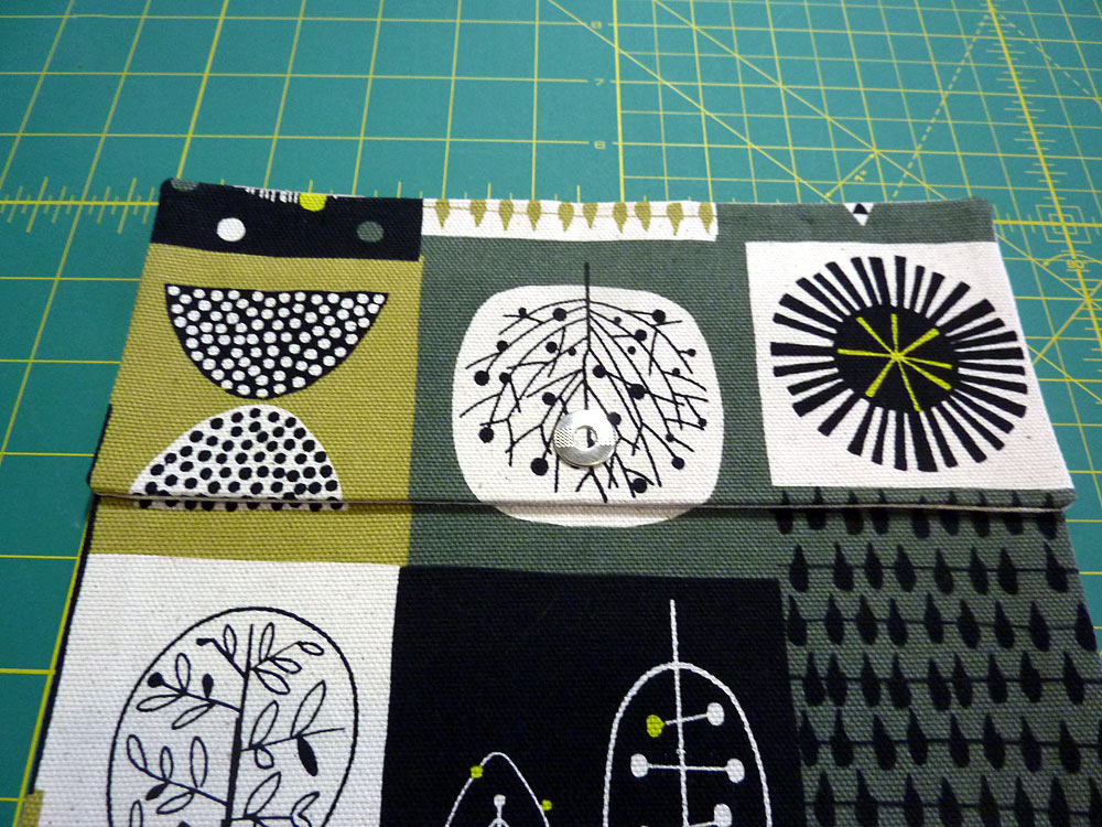 - Flip over the panel, and with the upper flap still extending flat, mark for the second decorative snap. It should be centered side to side, and its center point should be ½” up from the finished edge of the flap.