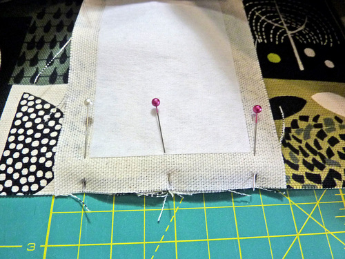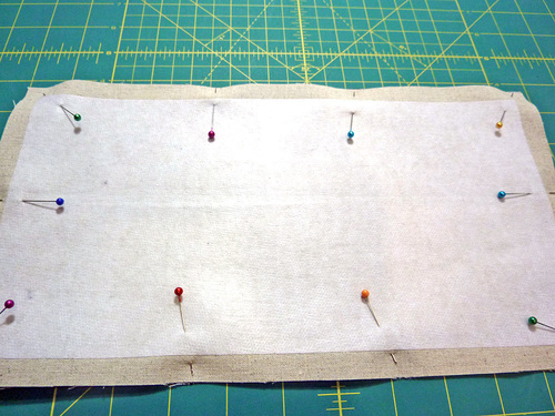 - Place the exterior front panel right side up and flat on your work surface. Place the pocket into position. Once more, your exact fussing cutting makes placement easy. The finish bottom edge of the pocket should sit 1” up from the bottom raw edge of the fabric panel. Pin the pocket in place along both sides and across the bottom.