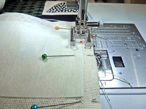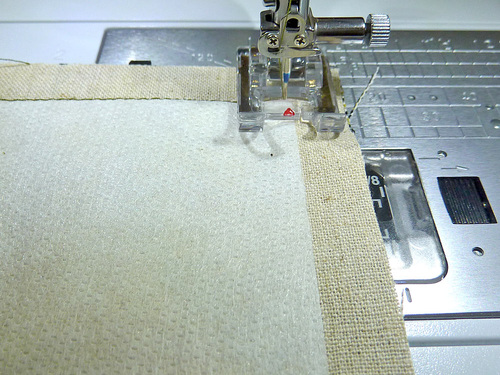 - Starting at the corner of the interfacing, and using a ½” seam allowance, stitch along this first side. Stop the seam at the opposite corner of the interfacing. In other words, your seam is starting and stopping ½” in from the edge of the base panel.