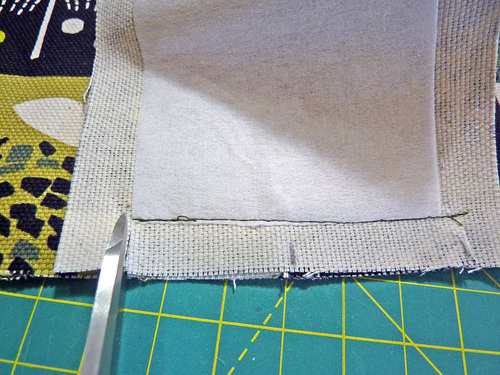 - Snip into the corner of the base panel at a diagonal at a depth of about ⅜”. You are clipping right up to but not through your stitching line, and you are just clipping the base panel. This frees up the seam allowance so it can bend or “ease” around the corner, allowing you to more easily stitch the final two sides.