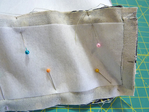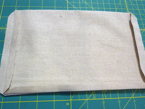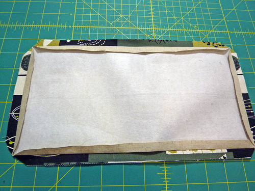 - Turn right side out through the opening and press flat, as with the exterior pocket, gently push out all the corners and press in the raw edges along the opening so they are flush with the sewn seam.