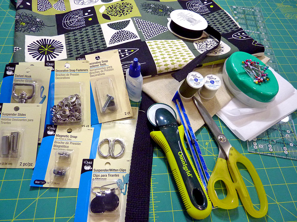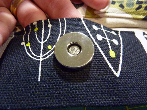 Our thanks to Dritz® for providing the key hardware components. Can you spot them all? Magnetic snaps and Decorative Snaps keep the top of the bag, as well as the exterior pocket and pouch, securely shut.