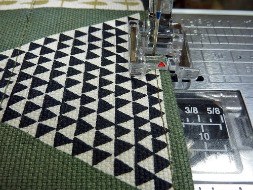 - Stitch both sides in place with a ½” seam allowance. Remember to start and stop the seams ½” in, which means you’ll drop your needle (and stop your needle) right on top of the corner’s perpendicular seam.