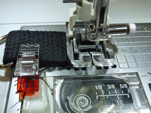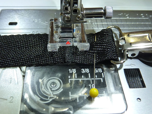- Loosen the adjusting loop as much as you need to fit it under the needel, then zig zag and straight stitch the raw end in place through both layers as you did above.