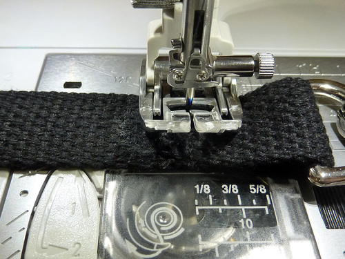 - Zig zag across the raw end through both layers. Then run a straight line of stitching just above the zig zag stitching. Trim all the thread tails as close as possible to the webbing.