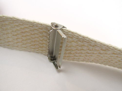 NOTE: Blacks are very hard to capture well in photos with good detail. So at this point, we decided to switch to a little mini strap sample, using a white webbing in order to best show how to thread the opposite raw edge through the suspender slide and the remaining swivel hook. In this photos, D-rings are standing in for the swivel hooks. - Thread the remaining raw end of the webbing through the top of the suspender slide, over the little gripper teeth. The hinge of the slide should be positioned so the teeth are facing backwards, as if pointing towards the raw end as it slides through.