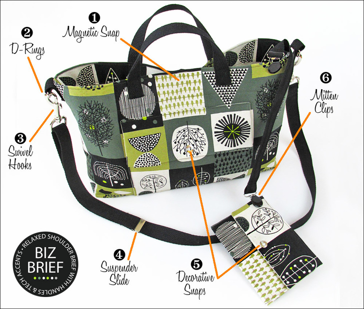 High-tech accents; like snaps, hooks, locks, and more provide both functionality as closures as well as professional style. If you want a “you made that yourself?!” reaction to your bag, you need to add the very best finishes. This slim shoulder bag uses six different Dritz® fasteners, including a pair of mitten clips to tether a matching inner pouch.