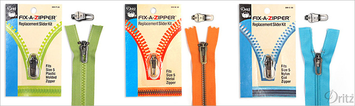 There are three styles of Fix-A-Zippper™ replacement slider kits. Each kit is designed to fit a standard 5mm zipper (also known as a Size 5), with the style options accommodating molded plastic, metal, and nylon coil zippers. All three of the sliders themselves are metal and look like a standard slider. On our test, the Dritz® replacement slider was actually better looking than the original!