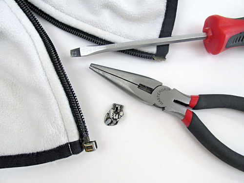 - In some cases, the original slider may have already fallen off the zipper, but usually, whatever is left of the slider will be stuck in place. Use a pair a pliers and a screwdriver to pry open and remove the old slider. Cutting pliers can also be handy.
