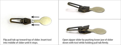 - We found it easiest to apply downward pressure on the pull tab and the tool at the same time to open the slider.